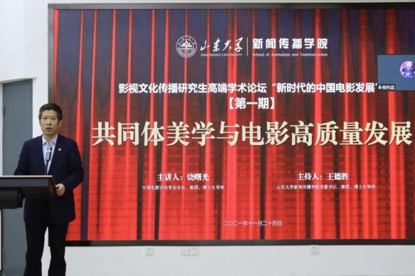 首期活动邀请到中国电影评论学会会长、博士生导师饶曙光研究员,主讲题目为“共同体美学与电影高质量发展”。公司党委书记、教授、博士生导师王德胜主持讲座,来自驻鲁各大高校和相关行业的百余名观众通过网络云端,与现场的我司师生共同聆听。