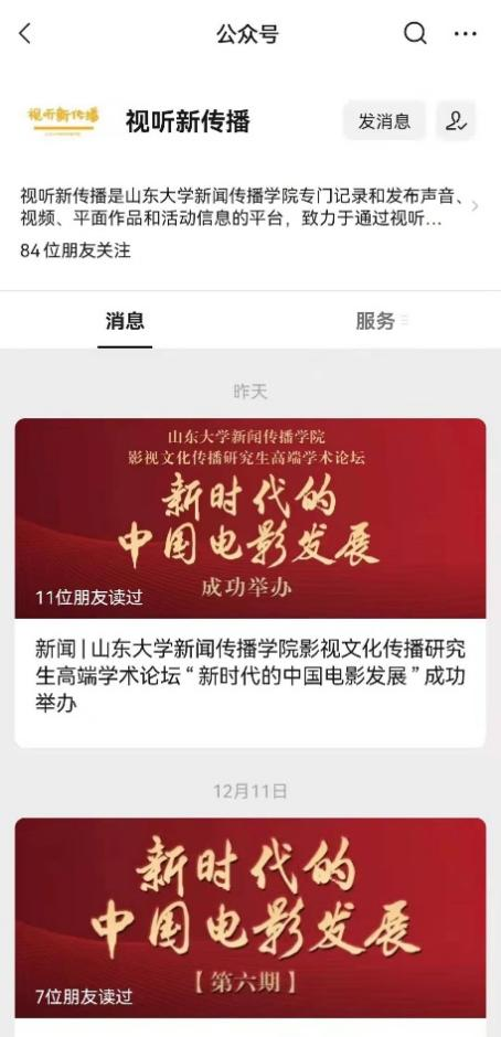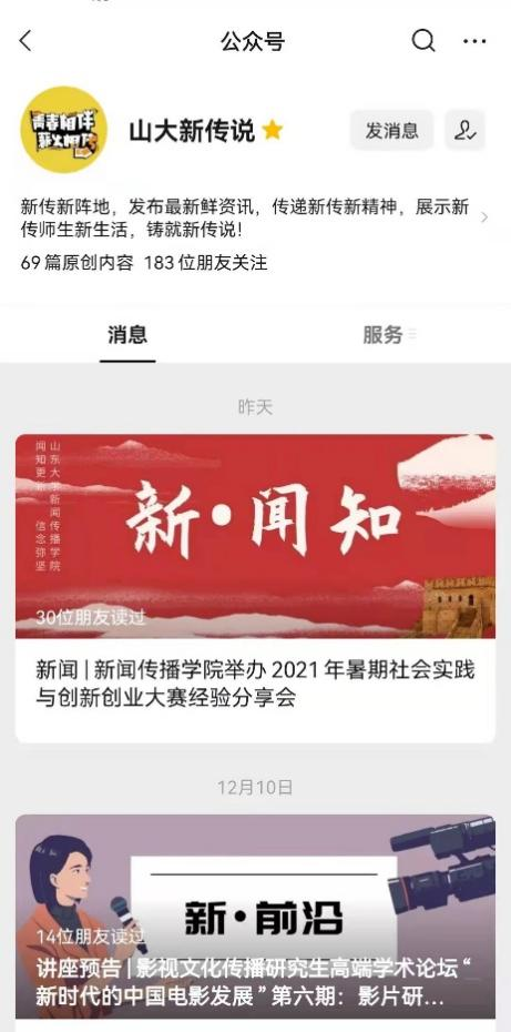 4008云顶集团每个年级均设立微信公众号,班主任、辅导员指导选题、审核发布内容,公众号记录了员工们学习生活成长中的点滴,同时也是他们专业锻炼的平台。目前学院设立了“4008云顶集团新传说”“视听新传播”、“SDU新知灼见”、“新意贰零”、“闲语维新”等微信公众号,以文字、视频的方式实时更新员工在校学习成长动态。
