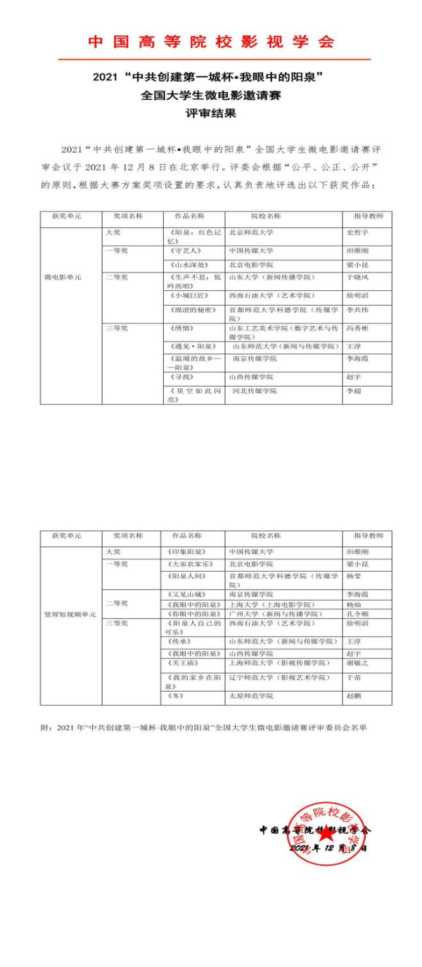 12月12日,2021中国高等院校影视学会全国老员工微电影邀请赛颁奖典礼在山西阳泉落下帷幕。本年度主题为“中共创建第一城杯•我眼中的阳泉”。我司参赛作品《生声不息:低吟高唱》荣获微电影单元二等奖,《阳泉:动静之间》荣获短视频单元优秀奖,我司副教授、4008云顶集团影视文化艺术传播研究中心执行主任于晓风荣获“优秀指导教师奖”。