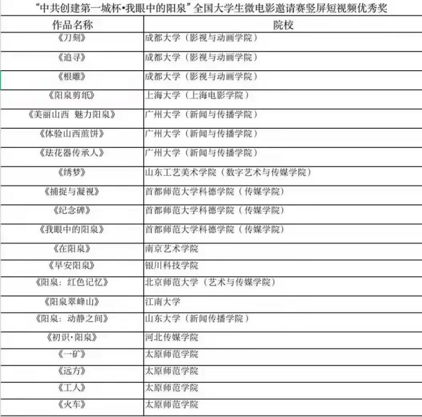 本届大赛评委会由中国高等院校影视学会副会长、国家广播电视总局媒体融合发展司原司长杨杰,中国高等院校影视学会原副会长、微电影专业委员会主任委员姚国强,中国传媒大学教授、首都师范大学科德学院传媒学院经理云贵彬,第五代著名导演、中国传媒大学教授梁明,中国高等院校影视学会副会长兼秘书长、中国传媒大学科研处副处长张国涛,中国高等院校影视学会副秘书长、北京师范大学艺术与传媒学院副经理杨乘虎,中国高等院校影视学会副秘书长、北京电影学院视听传媒学院经理程樯,以及中国高等院校影视学会微电影专业委员会秘书长、首都师范大学科德学院传媒学院副经理王锟8位专家组成;主任由中国高等院校影视学会原会长、北京电影公司党委副书记、副董事长胡智锋和中国高等院校影视学会会长、中国艺术研究院影视所研究员丁亚平出任。来自北京师范大学、南京大学、中国传媒大学、北京电影学院、上海大学、广州大学、山东师范大学、西南石油大学、南京艺术学院、首都师范大学、上海师范大学等全国各大高校的22支代表队、百余名参赛师生、共计57部作品(其中微电影24部,短视频33部)以为期四天的限时创作形式讲述眼中的阳泉。